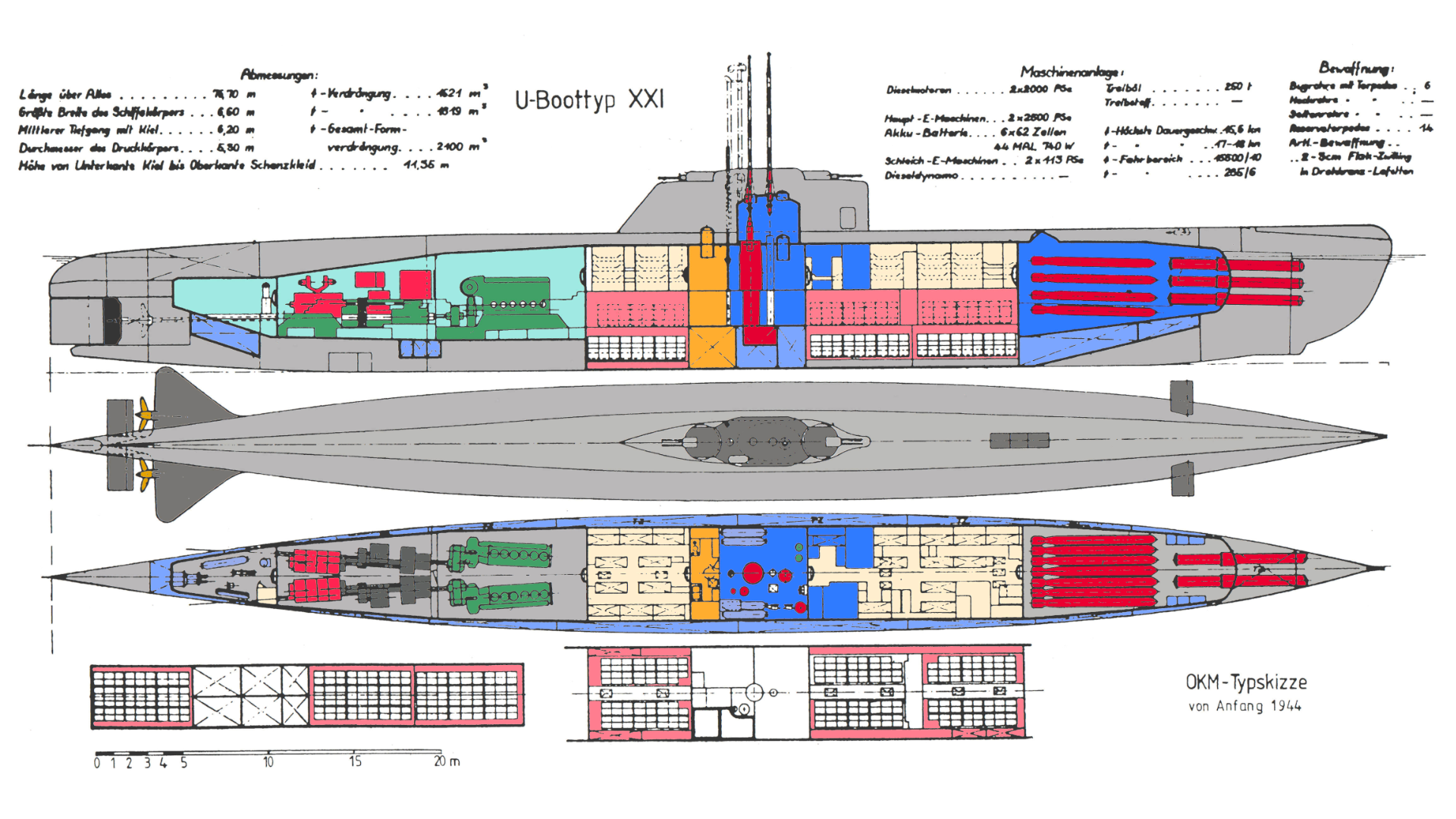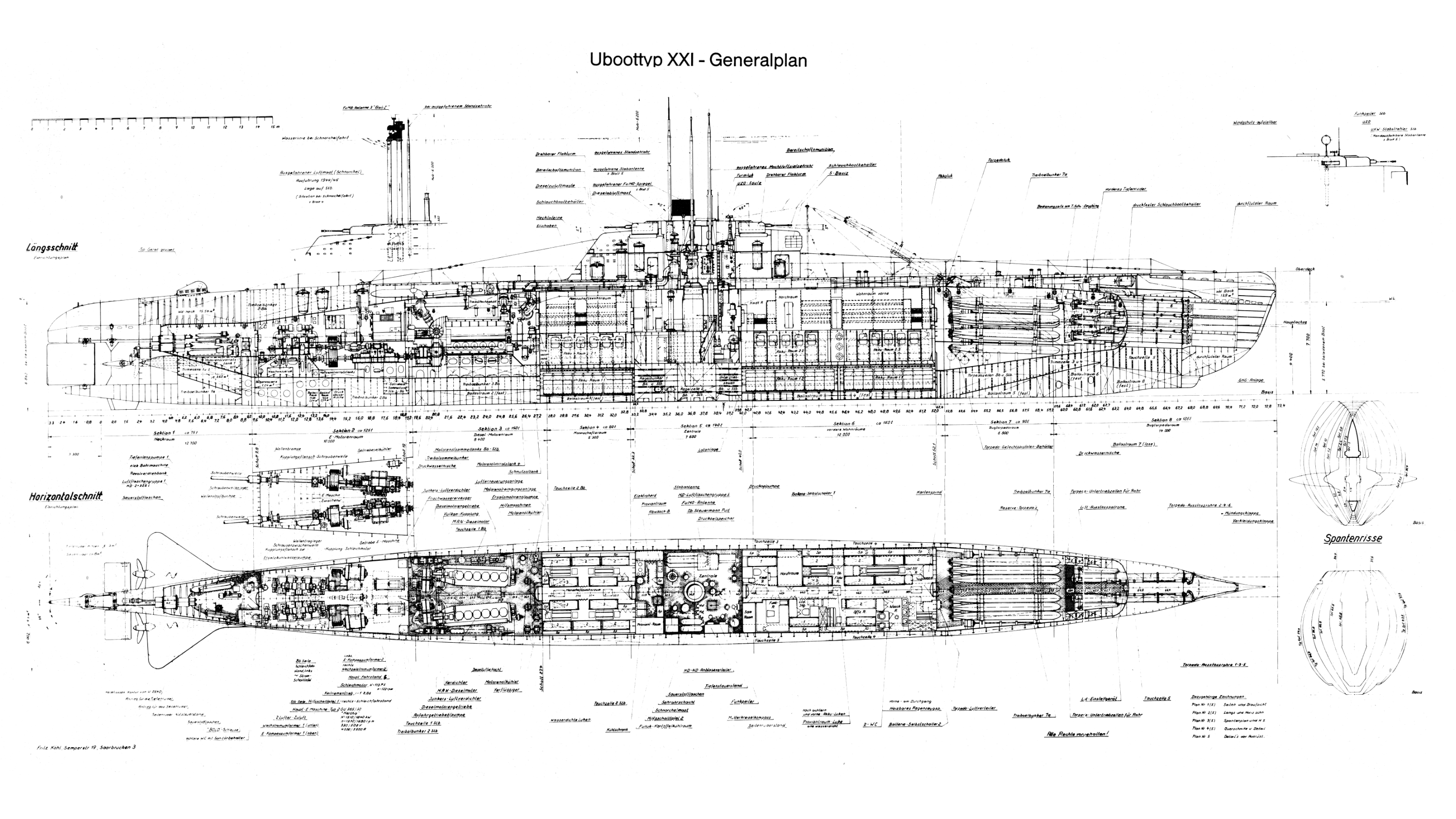 Type XXI submarines are considered the first “true” submarines because they were capable of conducting a wartime mission almost completely submerged. All previously developed submarines were more or less surface craft with the ability to operate submerged for short periods of time, mainly for attacking or dropping off the enemy.
